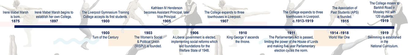 The Liverpool Gymnasium Training College was established in 1900 at the Liverpool Gymnasium. Very quickly, Marsh bought a townhouse at 110 Bedford Street, where 50 students could be accommodated, expanding again in 1907 to two more townhouses on the corner of Huskisson Street. Students were required to cycle several miles away to their playing fields in Wavertree or Calderstones for hockey and cricket practice, as well as towards Chester for rowing practice along the River Dee.